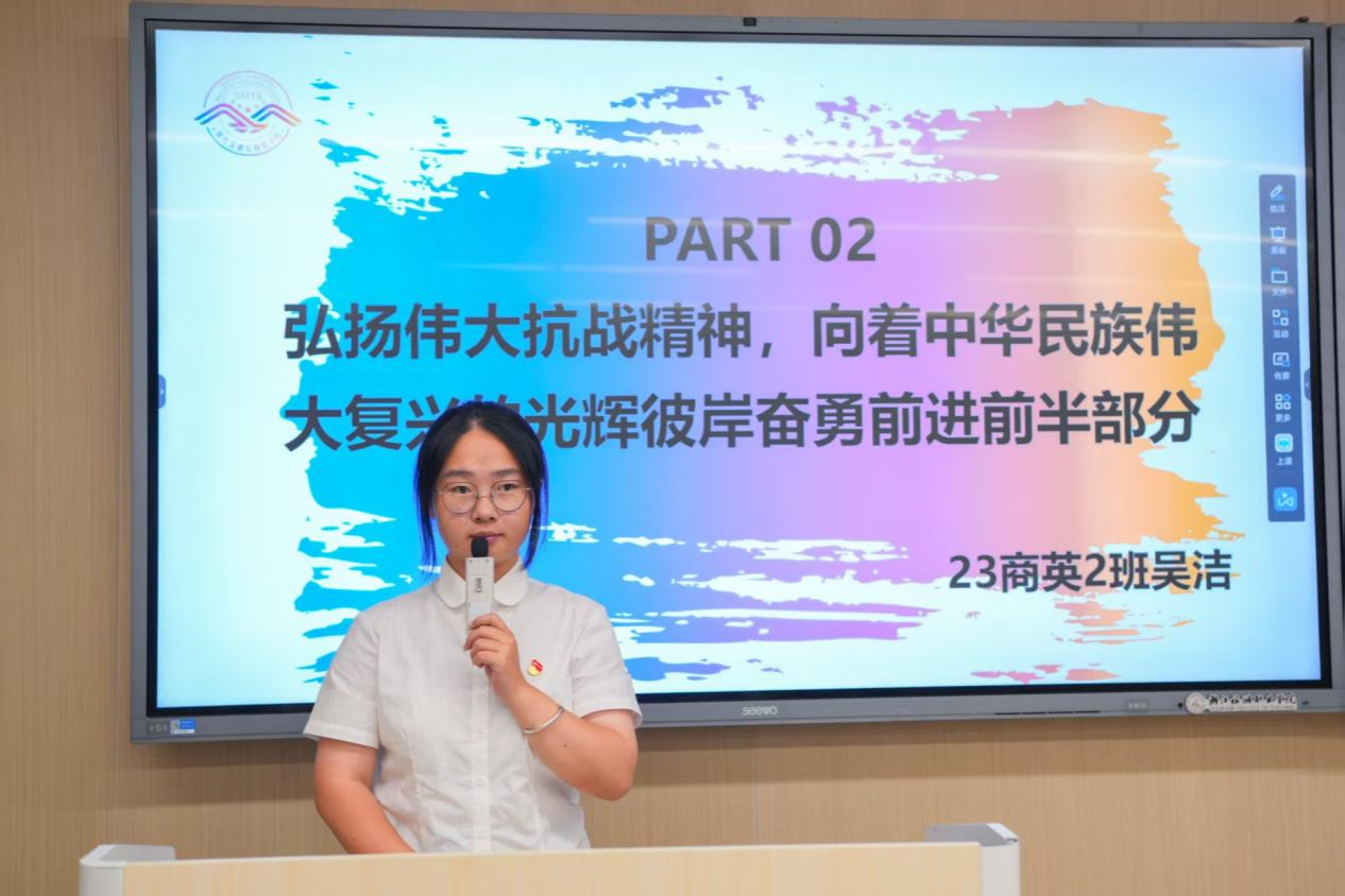 以8个篇章串联起抗战记忆与时代精神,令人心潮澎湃。从纪念抗战胜利80周年大会讲话到东北抗联英雄事迹,学生党员们的分享让历史不再遥远。“九一八”作为抗战起点的深刻剖析、总书记回信中蕴含的精神传承,都在提醒我们:伟大抗战精神不是陈列的史料,而是激励青年前行的火炬。作为新时代学子,当以抗联英雄为榜样,把爱国情化为奋斗力。