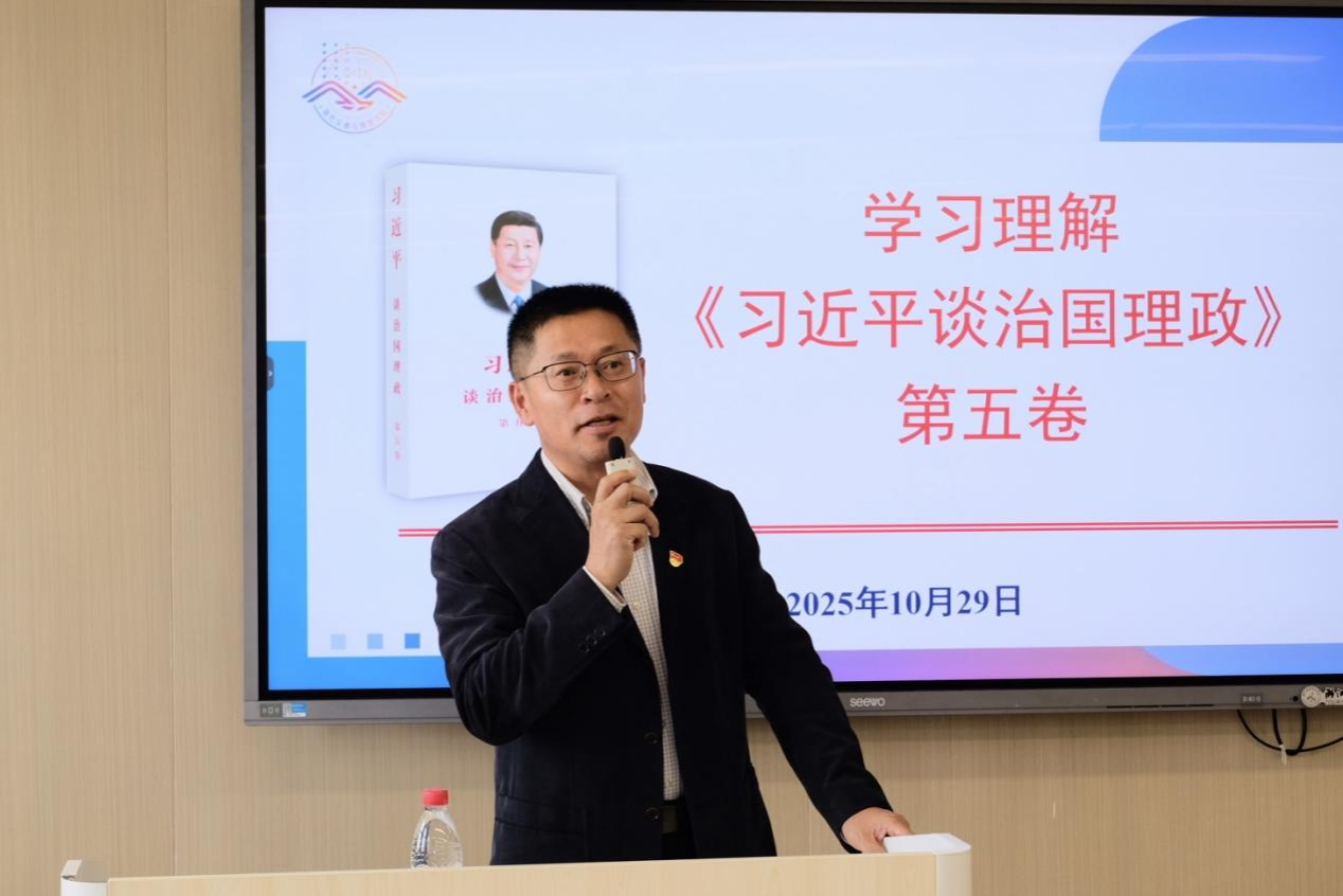 为深入学习贯彻习近平新时代中国特色社会主义思想,推动党的创新理论在校园落地生根,10月29日下午,现代交通与商贸学院组织开展《习近平谈治国理政》第五卷专题领学活动。学校党委委员、副校长韩永良以“学习理解《习近平谈治国理政》第五卷”为主题作领学报告,学院全体教师党员、部分非党员教师及学生党员参加学习。