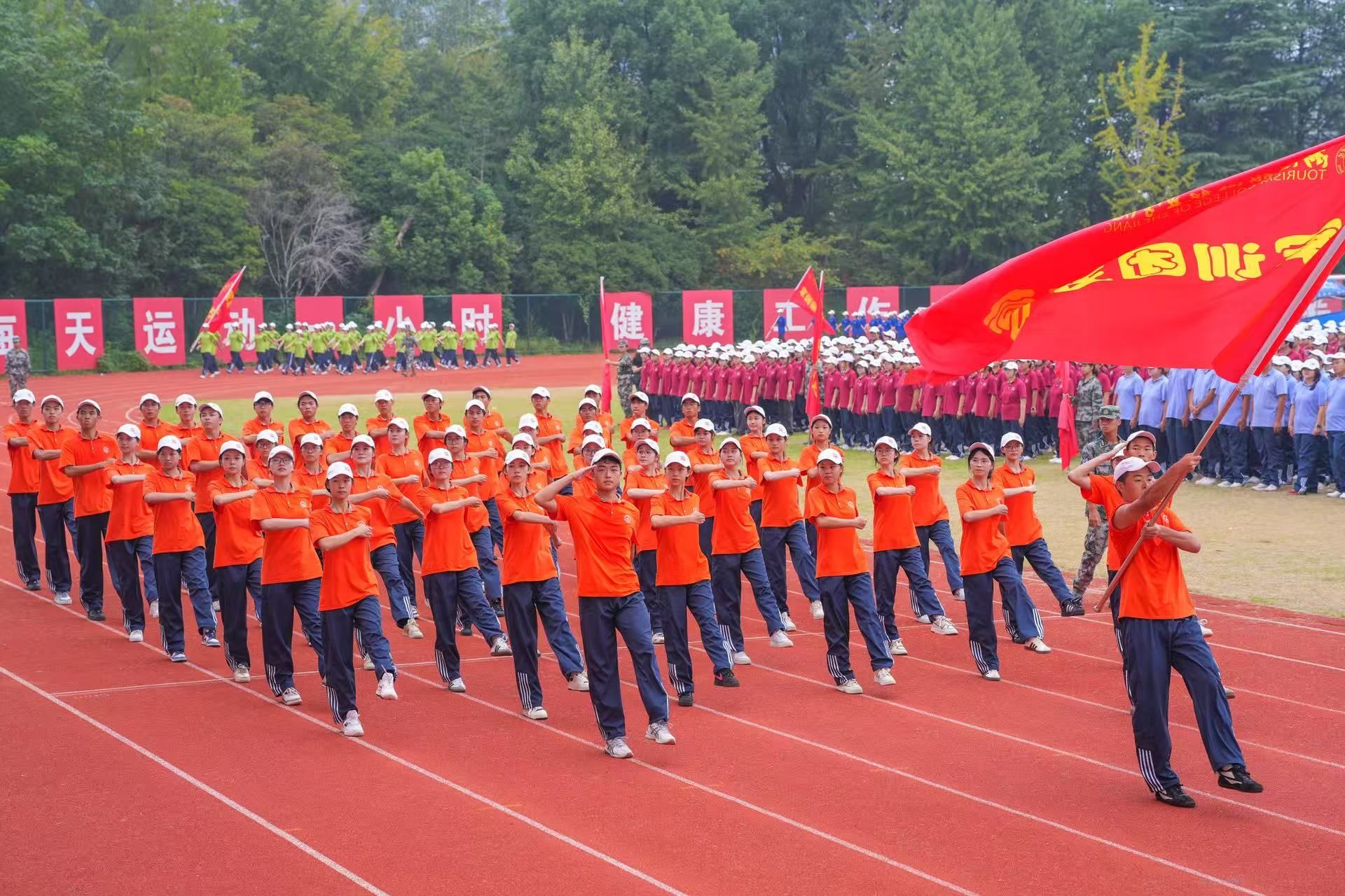 伴随着雄壮的《义勇军进行曲》,五星红旗冉冉升起,全体师生肃立行注目礼,爱国情怀在这一刻深深扎根心底,军训总结大会正式进入核心环节。